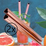 Zwei Metalltrinkhalme in Roségold in Herzform.