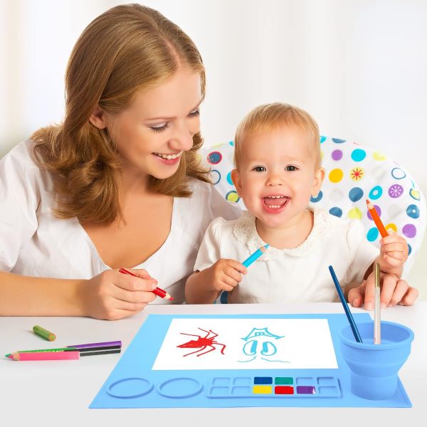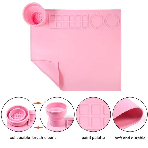 Unsere allererste Matte mit einem integrierten, zusammenklappbaren Pinselreinigungsbecher. Der Pinselreinigungsbecher ist so konzipiert, dass er Wasser aufnehmen und Pinsel reinigen kann.