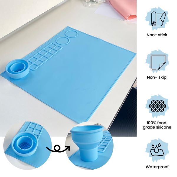 Diese wasserfeste, nicht klebende und rutschfeste Matte aus 100% lebensmittelechtem Silikon ist perfekt für alle Ihre Bastelarbeiten. Mit 14 Vertiefungen und einem Mischbereich ist sie perfekt für die Organisation Ihrer Materialien.
