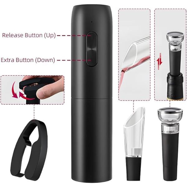 Das 5-in-1-Set für Weinliebhaber besteht aus einem automatischen Korkenzieher, einem Folienschneider, einem Luftsprudler, einem Vakuumstopfen und einer Aufbewahrungsbasis.