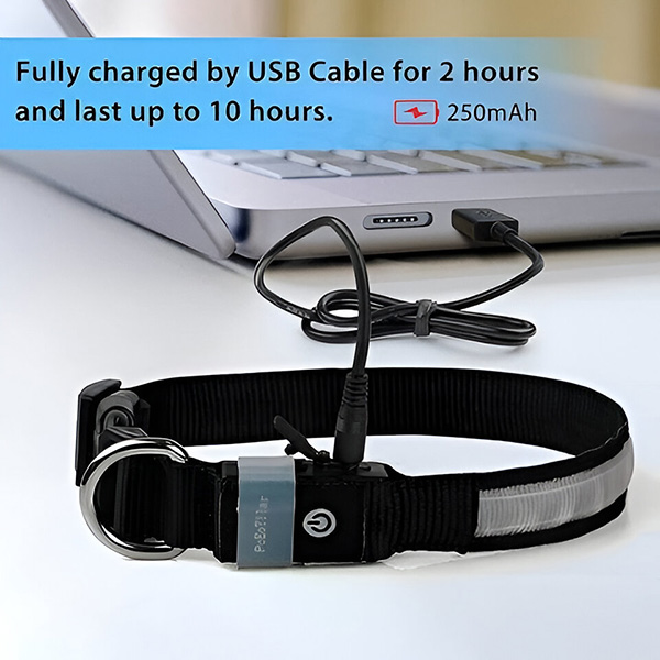 Kein Auswechseln der Batterien mehr. Dieses Halsband wird über ein USB-Kabel (im Lieferumfang enthalten) aufgeladen und bietet nach einer 2-stündigen Aufladung bis zu 10 Stunden Licht. Sie können es über ein Handy, einen Laptop, eine Powerbank oder ähnliches aufladen.